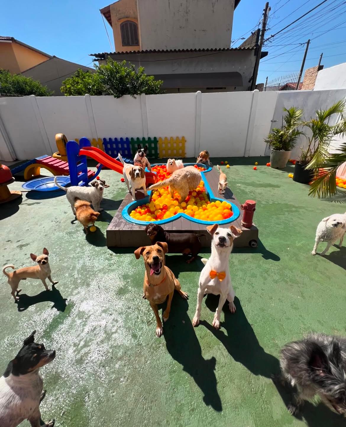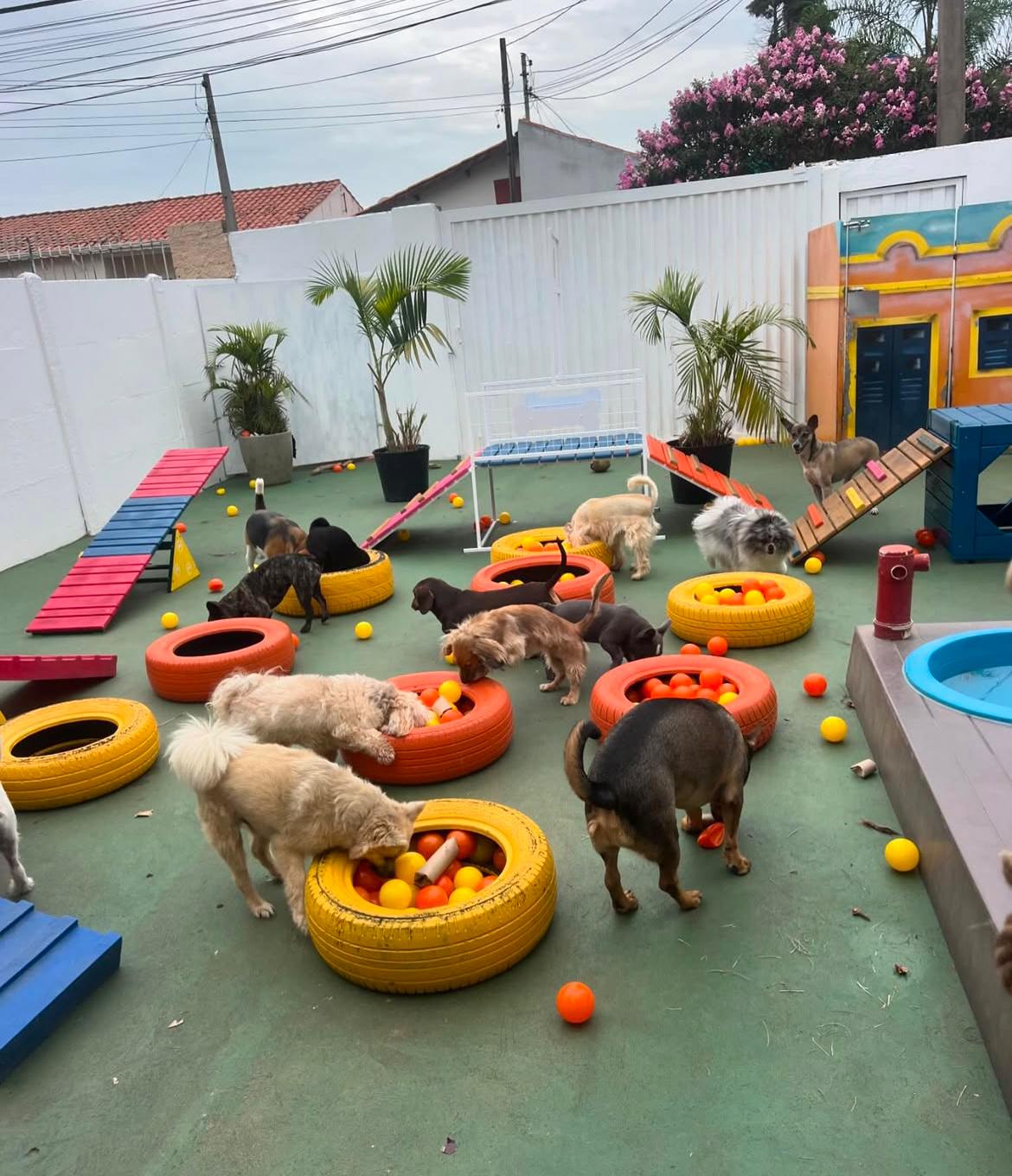 Bolinhas, frisbees e passeios monitorados dentro das instalações para estimular o movimento.